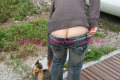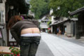 とある小京都として有名な 古い町並みが色濃く残る 街を訪れた時のことです。 サイズのかなり大きめのローライズだったので、歩いているうちにどんどんずり下がってしまって 歩きながら 「もう 完全にサイズ間違ってる!!」 「すごく歩きにくい!!!」 なんて 言いながら、でも、アキオはちょっと気がつくと お尻が見えてしまうのが とても嬉しいらしく いつもより ハイテンションです(笑) ただ 観光地ですし 撮影はさすがに出来なかったけど(小さな店が多くスタッフの人が店内に入るとずっと丁寧な応対をしてくれるので)、ちょこちょこショップに寄ったりしてたから、もちろんそこにはスタッフの人たちもいるから このすぐずり下がるのは とても気になります(^_^;) ちょっと油断するとすぐに お尻がみえてしまうから・・・・ 今回は、猫と遊ぶことにに夢中になってしまい、周りに人がいることに気づかずに 後からすごく恥ずかしい思いが込み上げてきて・・・・・