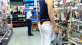 白いローライズを穿いて これが下着が半分くらいでてしまう すごいローライズで しかも透け感もあったりして とてもエッチなんです。 最初は ホームセンターの店内を ぐるぐると歩いて回り 多くの人に 見られて いつものように 何人かの男性は つかず離れず 陰からこそこそと付いてくるんです。 こうやって見られるのが もう快感で快感で すごくすごく感じてしまいます(´Д`) それから、わざと男性に近づいて近くでしっかりと見られたり、・・・・・